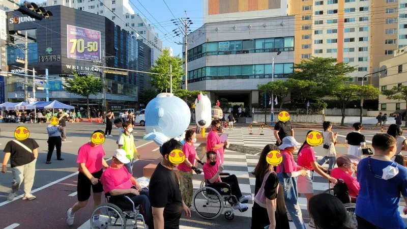 축제장은 보행이 자유로운 사람만 다니지 않습니다. 휠체어를 탄 물결도 지나갑니다.