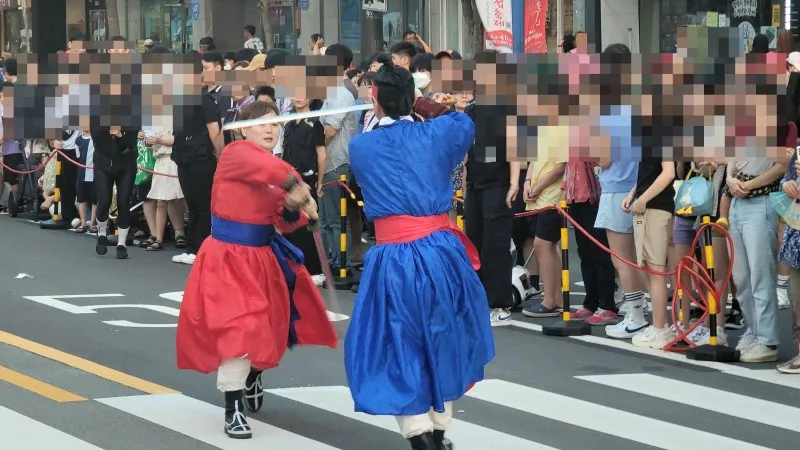 전통 무예 일행이 무예 시범을 보입니다.
