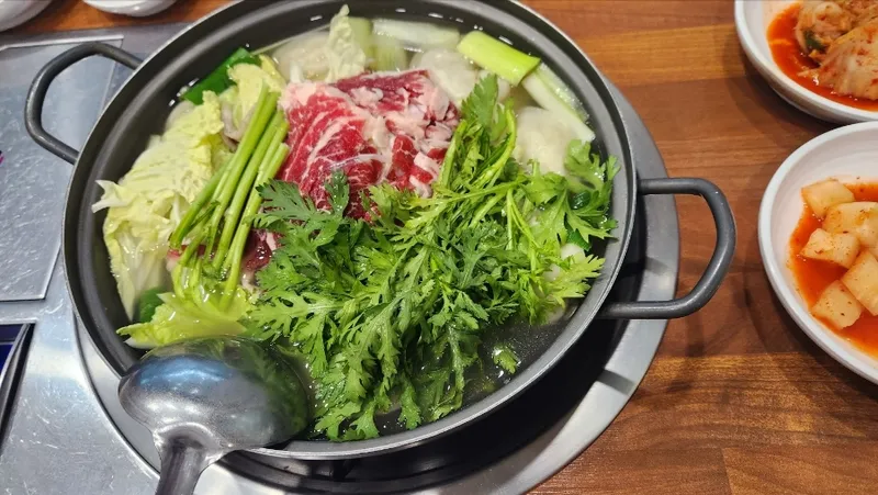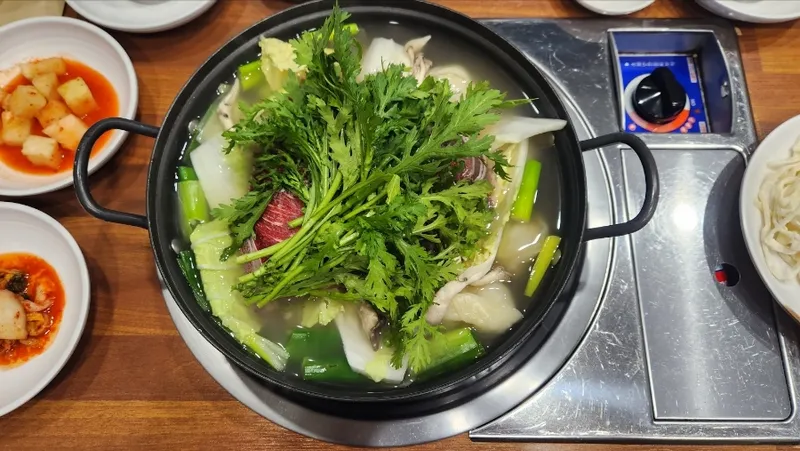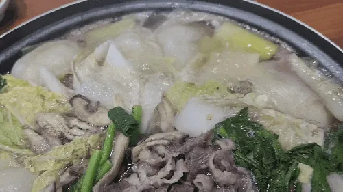 소고기 등이 함께 끓여진 맑은 국물 전골로,