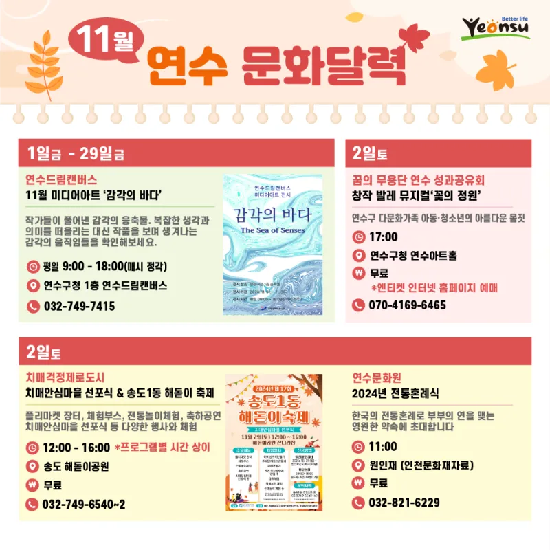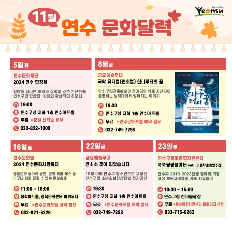 👨👩👧👦2024 연수문화사랑축제👨👩👧👦 📆 2024. 11. 16. (토) 11:00 ~ 18:00 📍 청학아트홀, 청학문화센터 야외무대 📜 생활문화 동아리 공연, 문화 체험 부스 등 누구나 함께 즐길 수 있는 문화축제 📞 032-821-6229 |