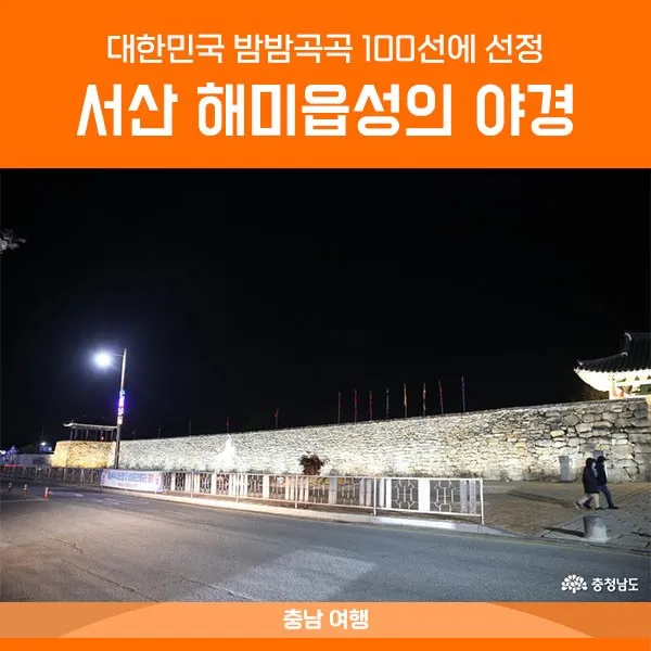 서산 해미읍성은 밤에 가보면 좋은 여행지로 자리를 잡아가고 있습니다. 서산해미읍성은 진남문 성벽에 병영성을 형상화한 야간 조명이 있으며, 성 내에는 산책길을 따라 동헌, 객사, 내아, 호서좌영루, 청허정, 옥사 앞 회화나무, 동헌 앞 느티나무, 민속가옥 등에 야간 조명이 설치돼어 있습니다.