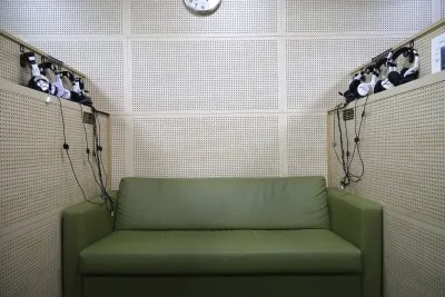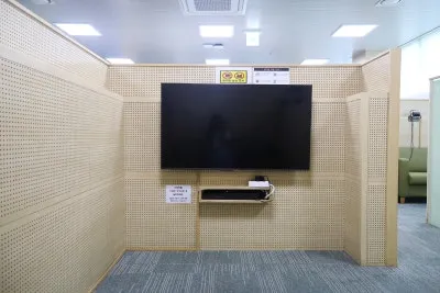 매 부스마다 이렇게 방음처리, 헤드셋 세팅, 리모컨과 TV가 준비되어 있습니다.