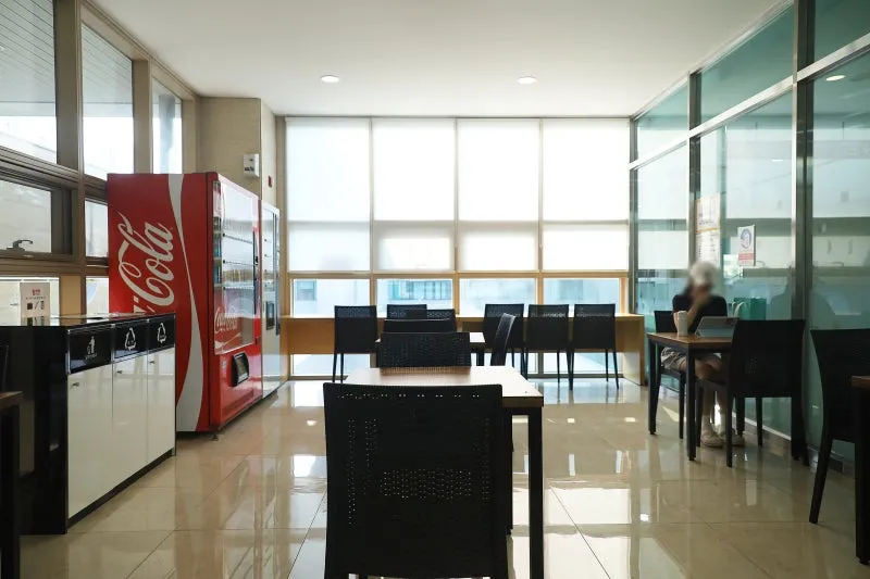 이곳에 넉넉한 테이블이 준비되어 있고, 자판기도 있어 음료를 마실 수도 있습니다.