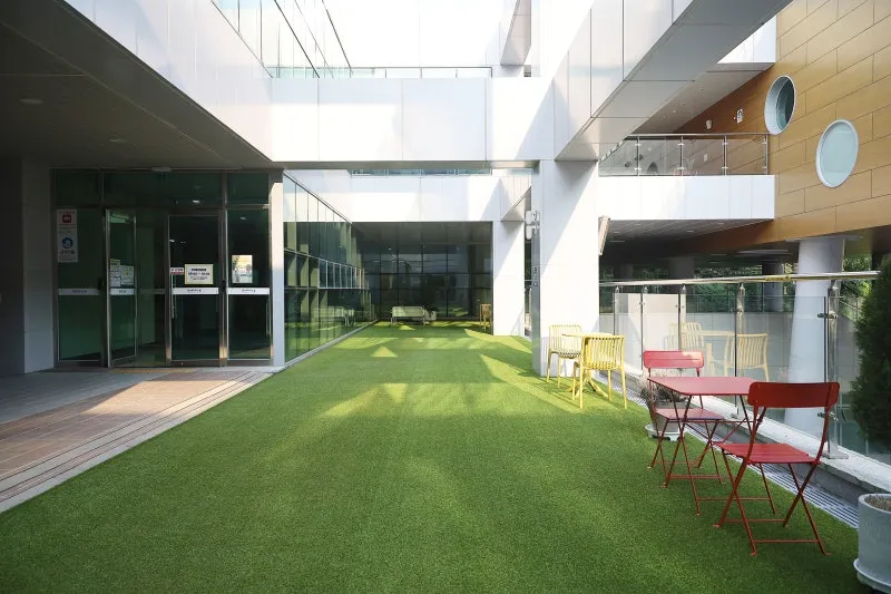실내 쉼터뿐만 아니라 인조잔디를 심은 야외 쉼터도 만들었고, 밖에 파고라를 만들어 감성적인 휴식장소를 조성하였습니다.