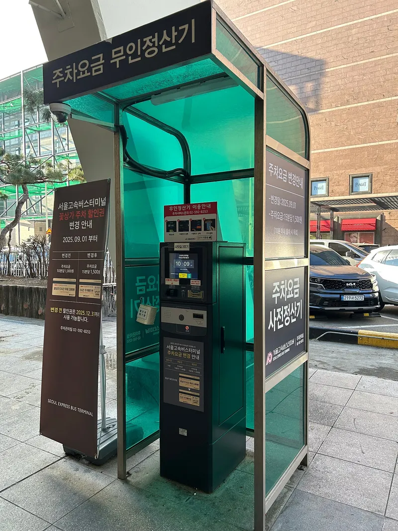 건물 앞에 '주차요금 무인정산기'가 있습니다.