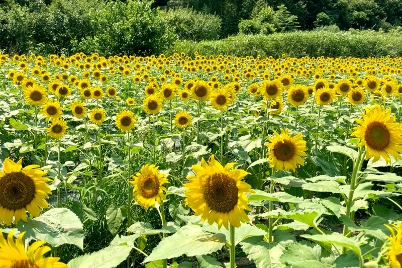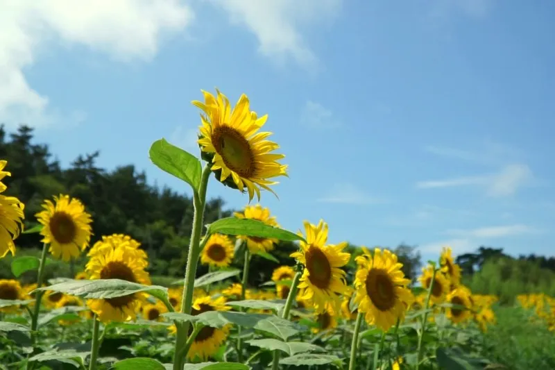 다음으로 만나볼 태안 가을 여행지는 얼굴만큼 큼직한 가을 해바라기로 가득한 해바라기 밭을 볼 수 있는 해바라기 올래정원입니다. 한적한 숲속에 파란 하늘과 대비되어 샛노란 물결처럼 펼쳐지는 해바라기 풍경이 색다른 가을 정취를 더해줍니다.