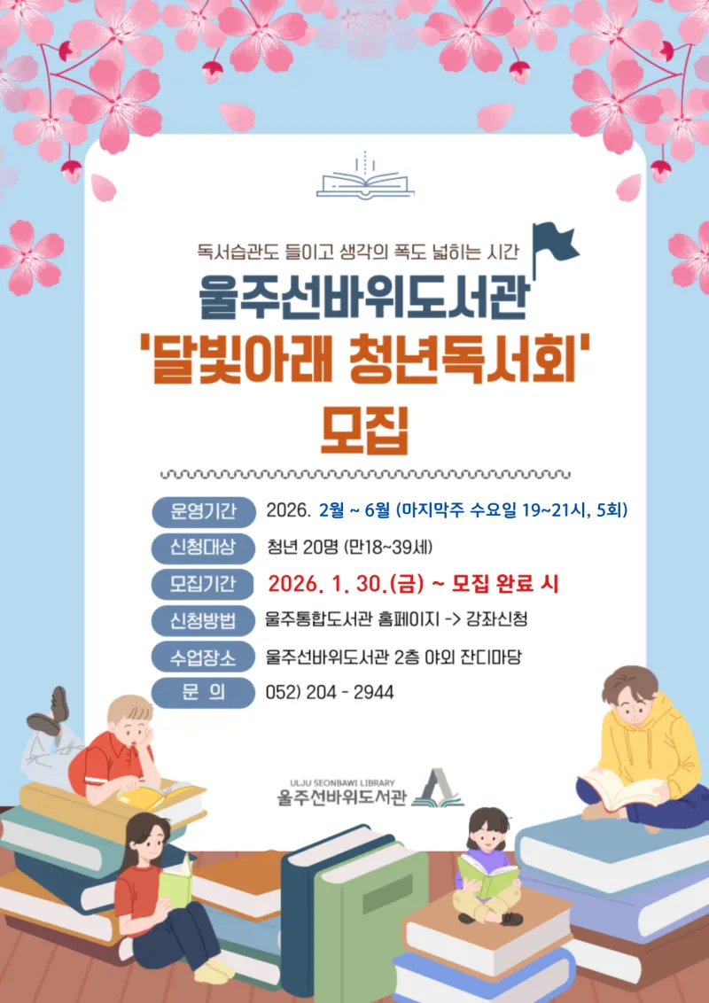 혹시 바쁜 일상 속에서 책 한 권 온전히 읽어낼 여유를 잃어버리진 않으셨나요? 울주선바위도서관에서 청년들을 위해 아주 특별한 밤을 준비했습니다. 이름부터 낭만적인 '달빛아래 청년독서회'인데요.