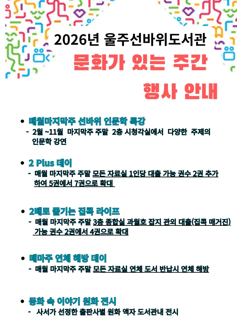 매월 마지막주 주말 모든 자료실 1인당 대출 가능 권수 2권 추가하여 5권에서 7권으로 확대