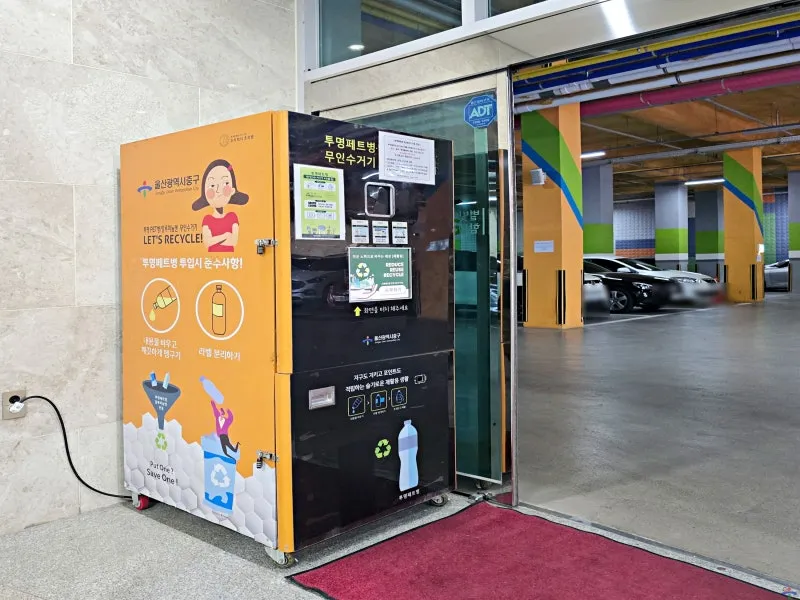 지하주차장에는 투명 페트병 무인 수거기가 설치되어 있습니다.