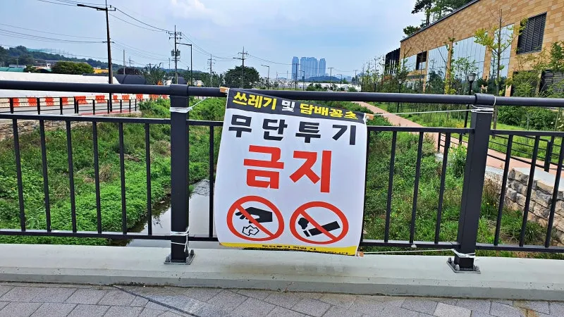 깨끗한 하천과 자연보호를 위해서 하천에 쓰레기와 담배꽁초 무단투기를 금지하고 있습니다. 무단투기 적발 시 100만 원 이하의 과태료가 부과됩니다. 다 같이 우리 동네 자연보호에 힘을 씁시다~~!