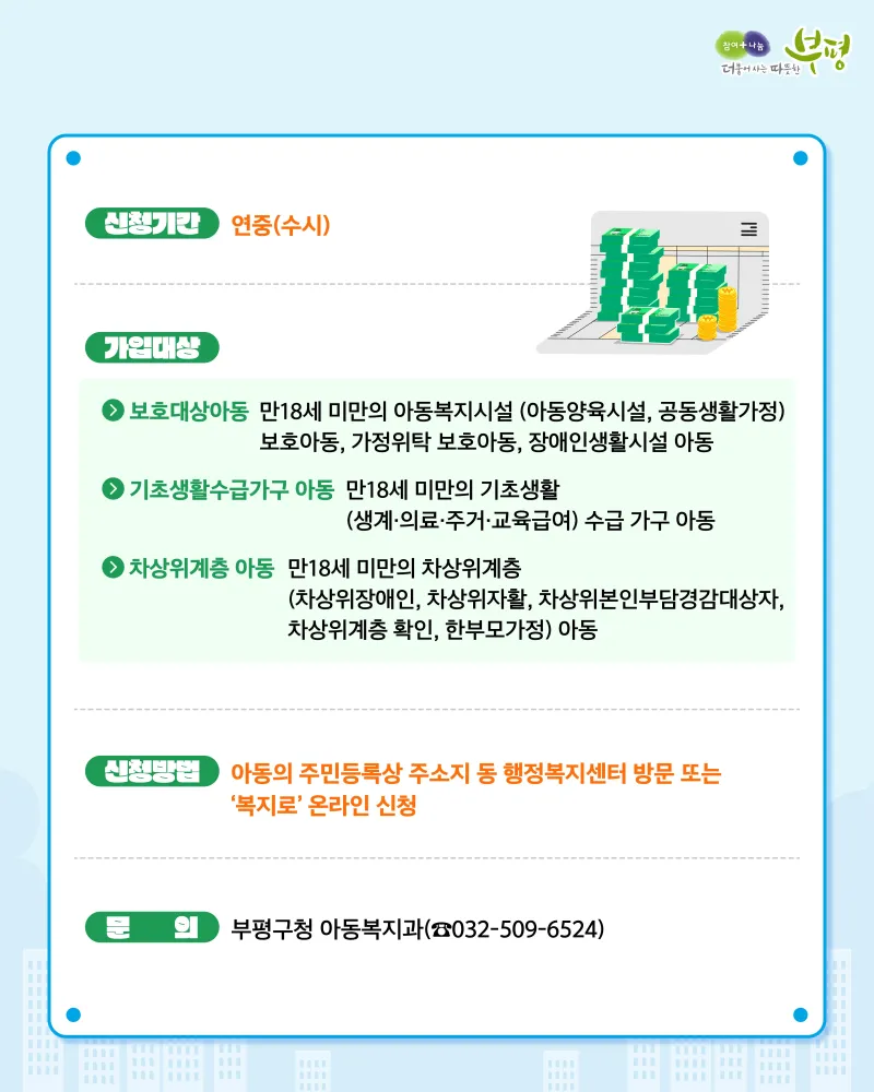 만18세 미만의 아동복지시설 (아동양육시설, 공동생활가정) 보호아동, 가정위탁 보호아동, 장애인생활시설 아동 |