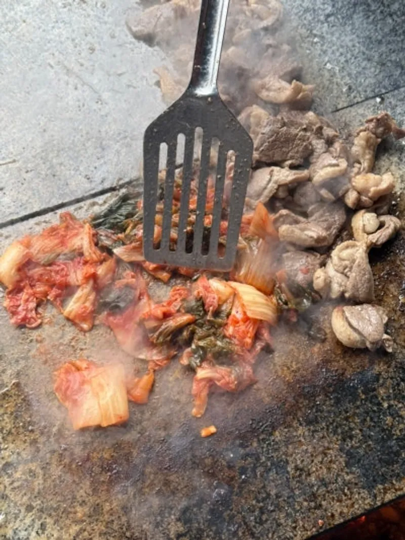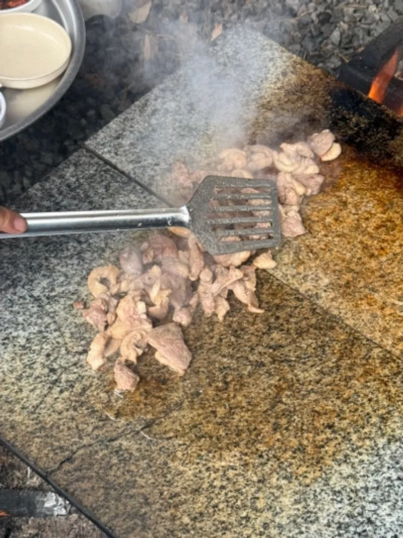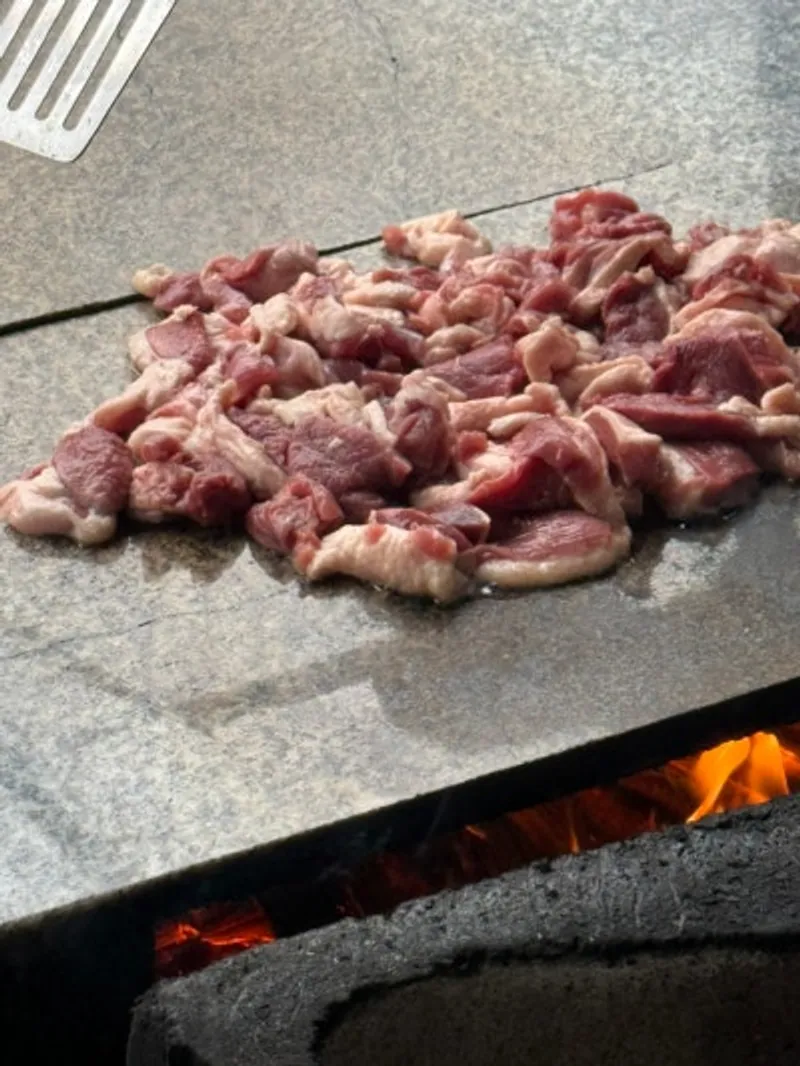 👧평화 : 지글지글 구워지는 잘 손질된 오리고기들을 봐! 정말 맛있겠다~🍖