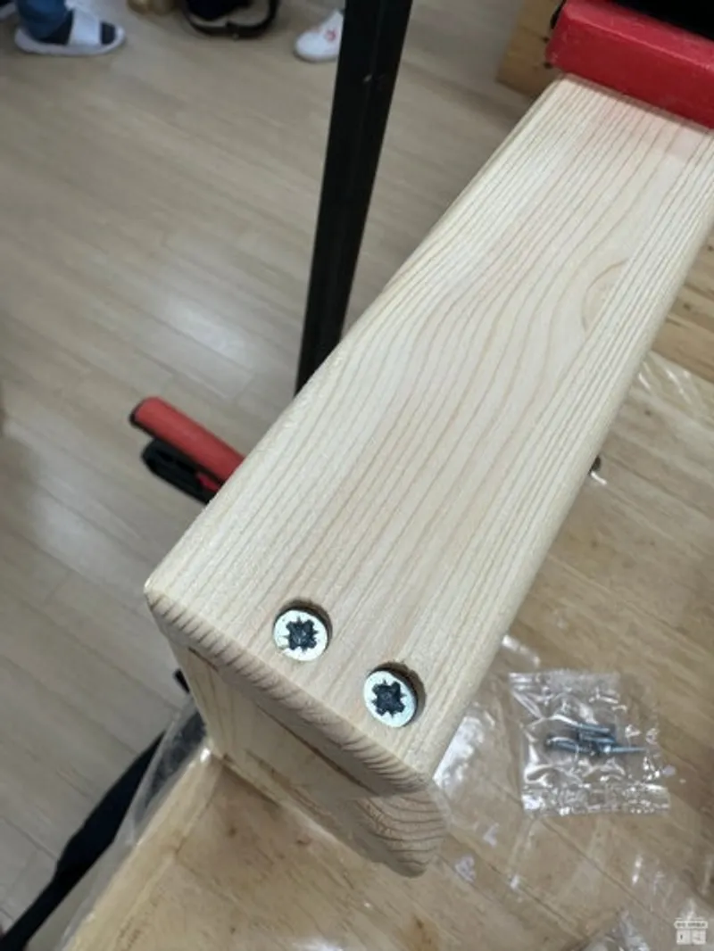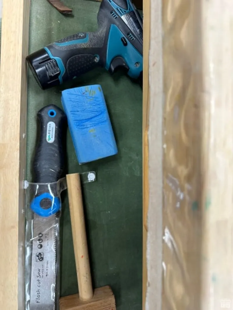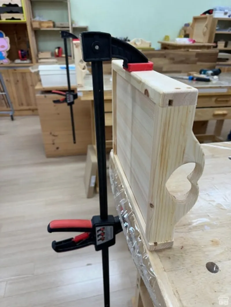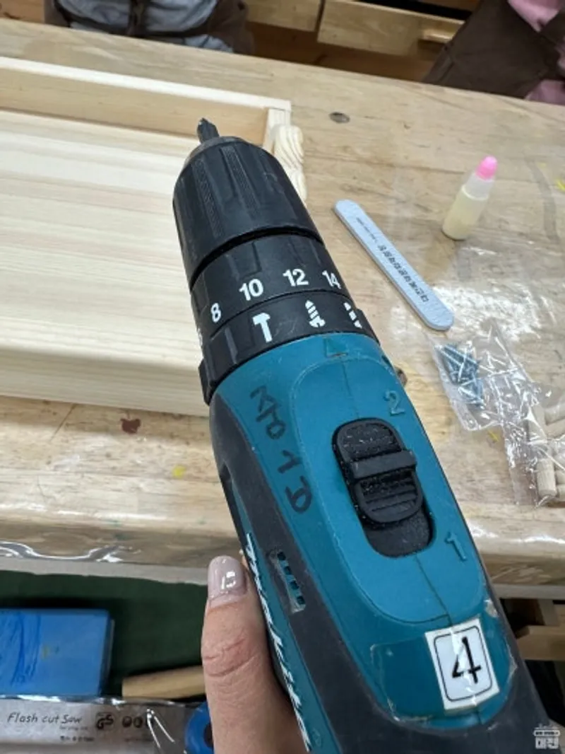 강사님께 주의 사항 및 장비에 관한 안전교육도 받았습니다. 처음 사용하는 전동드릴이었지만 몇 번 하다 보니 익숙해져서 상자 밑판과 손잡이 부분을 연결할 수 있었습니다. 미리 모든 재료가 재단되어 있어서 직접 나사를 사용하여 조립할 수 있었습니다.