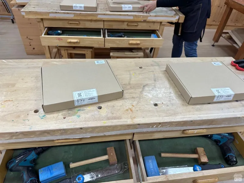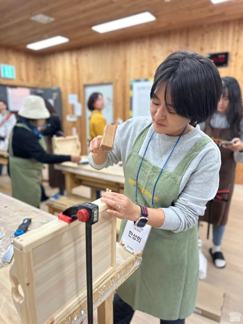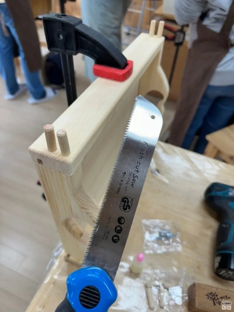 목재 교육전문가들과 함께 목재 체험을 하며 실톱, 전동드릴, 망치, 사포 등을 사용하여 목재를 다루는 실습 교육을 받았습니다.