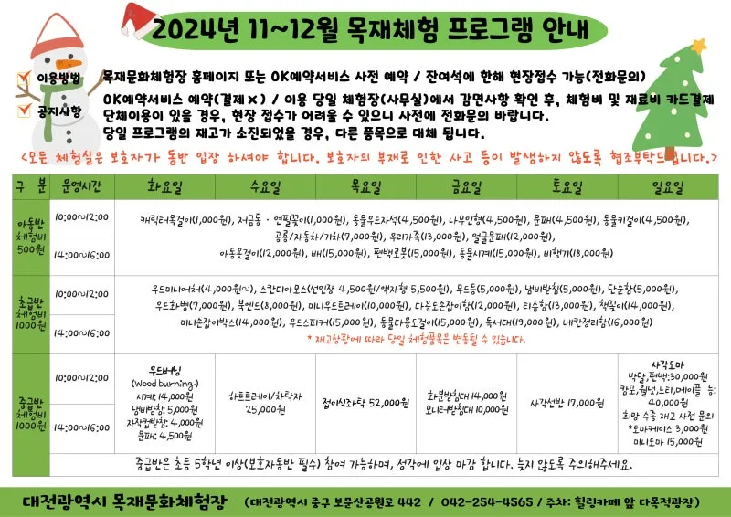 대전 목재 문화 체험 프로그램 참여 방법은 사전 예약 (OK 예약서비스) 또는 현장 접수를 할 수 있습니다. 체험 뿐만 아니라 나무 상상 놀이터도 OK 예약서비스를 이용하여 예약할 수 있습니다.