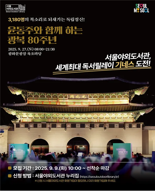 윤동주 시인과 함께 하는 광복 80주년, 광화문광장에서 '세계 최대 독서 릴레이' 기네스북 도전해요(9/27)