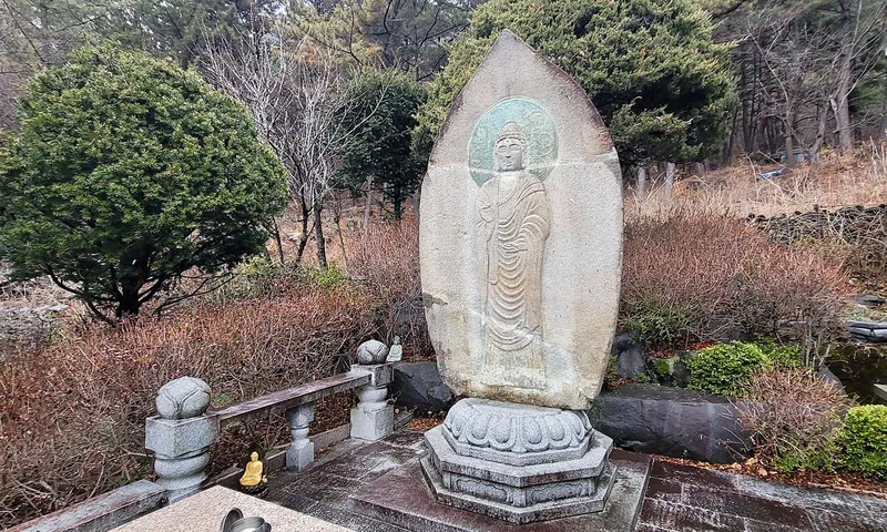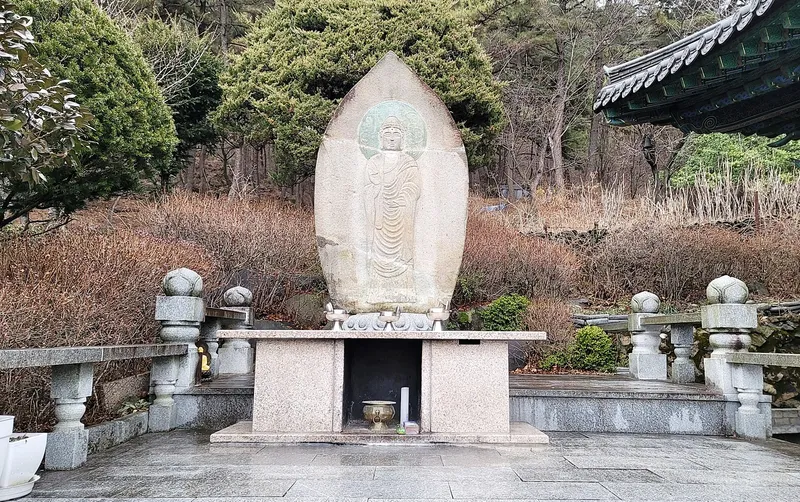 뒤로 보이는 산이 계족산의 일부겠죠? 그런데 대웅전 계단 아래에는 좌우로 석등이 있고 대웅전을 보며 왼쪽으로 촛불 모양의 광배가 있는 부처입상이 보입니다.