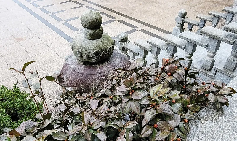 석등 위에 있는 나무가 꽃망울이 달렸습니다. 가까이에 가서 보니 동백꽃입니다.