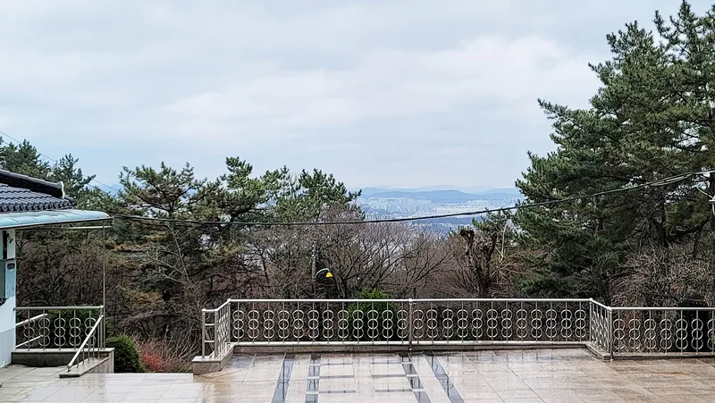용화사 대웅전 앞마당에 서면 대전 시내가 저 아래 까마득하게 펼쳐져 있습니다. 계족산 용화사가 있는 위치가 상당히 높은 산이라는 것을 알 수 있습니다.