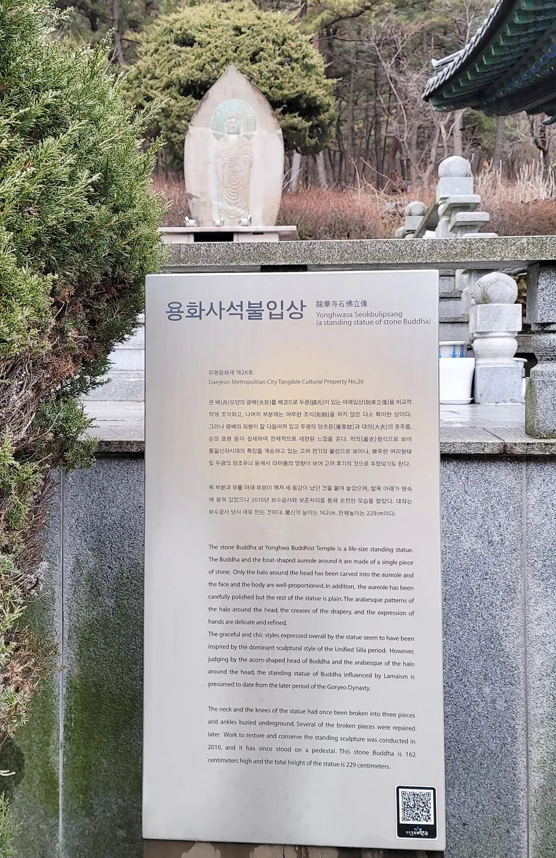 용화사석불입상 계단 아래에는 부처입상 안내문이 있습니다. 용화사석불입상은 대전시 유형문화재 제26호라고 합니다.