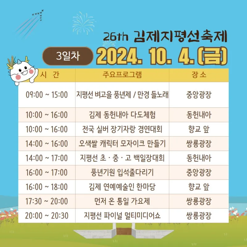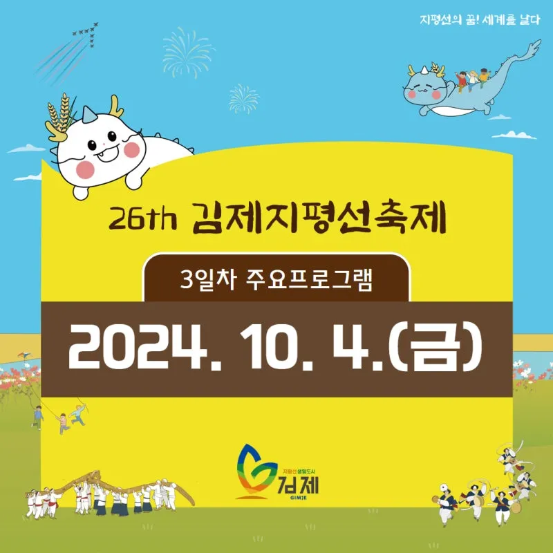 10월 4일 금요일의 지평선축제는 '지평선 벼고을 풍년제'와 '만경 들노래'를 시작으로 전국 실버 장기자랑 경연대회, 지평선 초중고 백일장 대회, 김제 연예예술인 한마당 등이 펼쳐집니다!