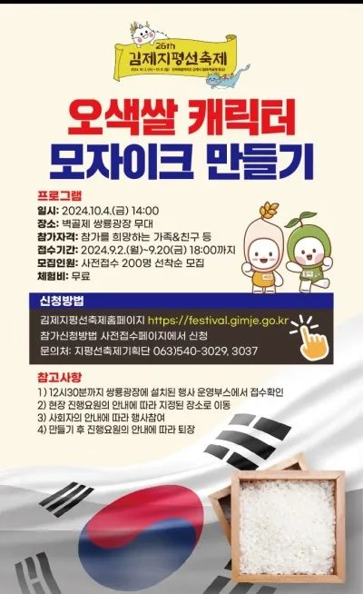 4일 오늘 단 하루! 오후 2시 쌍룡광장에서 진행되는 오색쌀 캐릭터 모자이크 만들기 뿐만 아니라 오후 4시 중앙광장에서는 우리 가족의 단합력을 증진시킬 수 있는 풍년기원 입석 줄다리기가 진행된답니다!