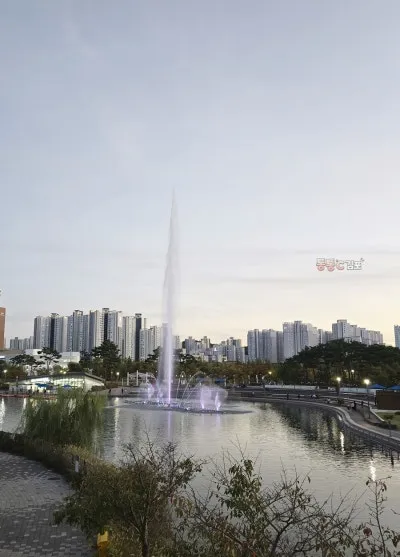어머나! 해가 뉘엿뉘엿 떨어지려고, 하니 분수 물줄기가 솟아나고 색색의 조명 불빛이 들어오더라고요.
