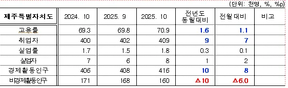 올해 10월 기준 제주 취업자 수는 409천 명,