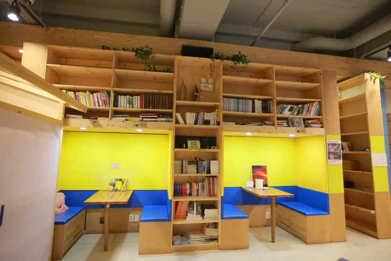 '와글와글 광장'의 내부입니다. 이곳은 다목적 공간으로 공연장과 북카페 소모임 마당으로 이용할 수 있습니다. 테이블이 있는 공간에서 쉼을 즐길 수 있고요. 서가가 있는 곳은 상시 활용할 수 있는 공간으로 행사 등 공연장 대관 시에는 사전 예약 후 이용할 수 있습니다.