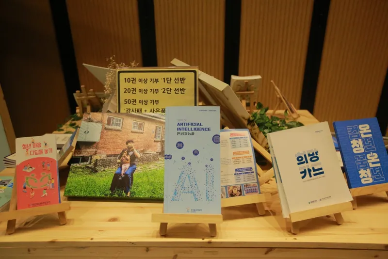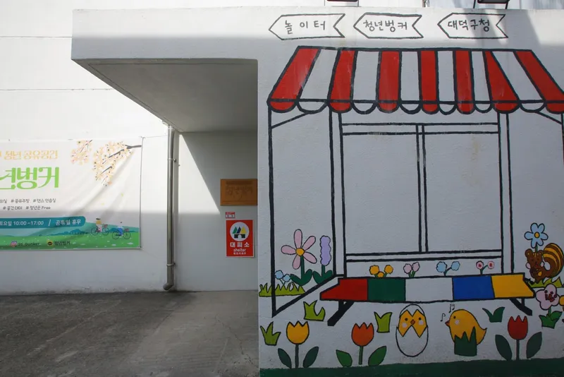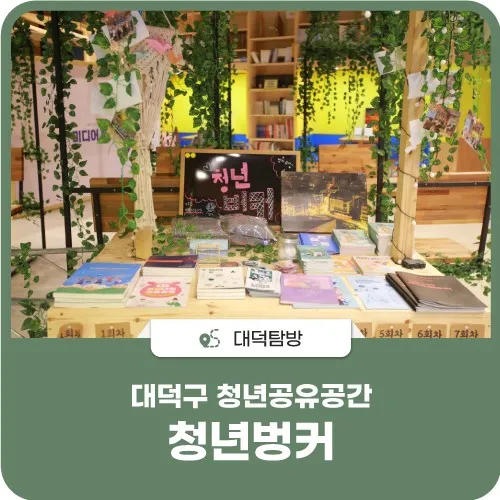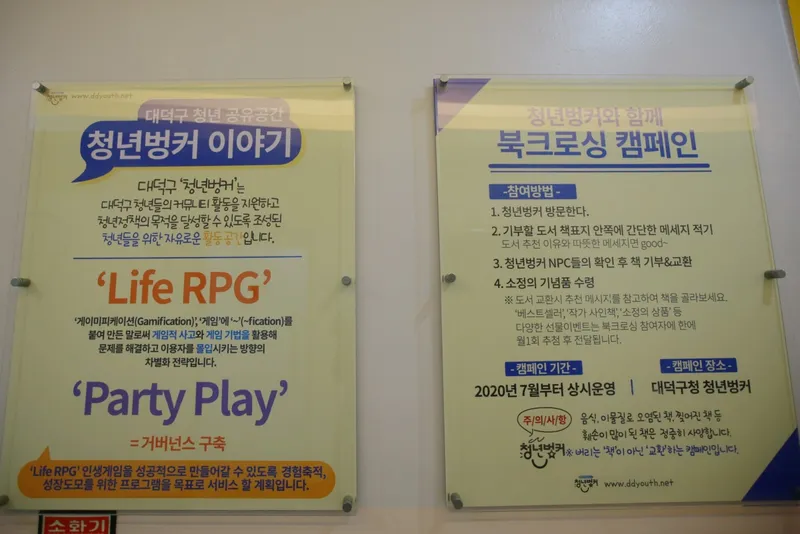 '청년벙커'는 대덕구 청년들의 커뮤니티 활동을 지원하고 청년정책의 목적을 달성할 수 있도록 조성된 공간으로써 청년들이 자유롭게 활동할 수 있습니다. 옆에는 #북크로싱 캠페인 참여 방법이 안내되어 있는데, 이를 통해 소통이란 무엇인지도 생각해보게 됩니다.