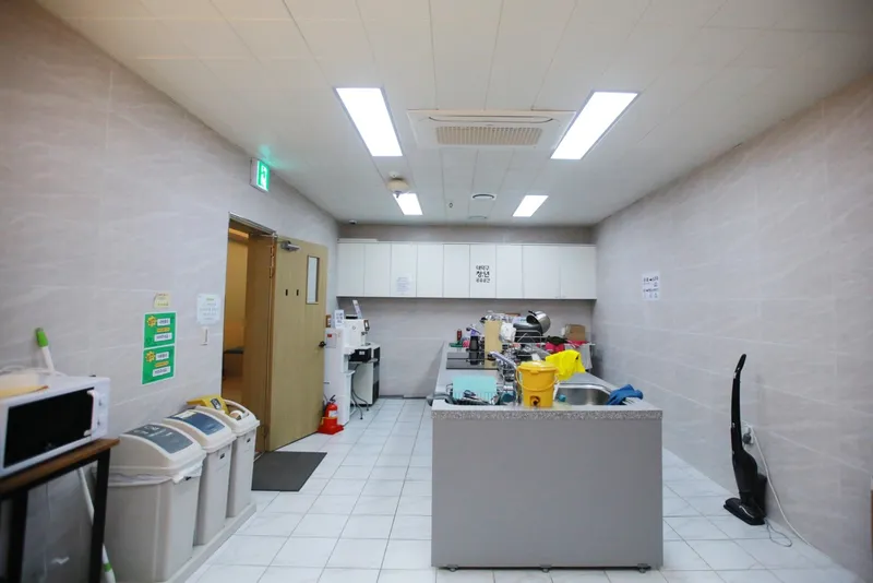 다음으로 소개할 공간은 공유 주방입니다. '연금술사의 집'이라는 이름답게 부엌에서 어떤 결과가 나올까 기대되는데요. 음식을 조리 할 수 있는 공간과 냉장고, 커피머신기 등도 구비되어 있더라고요.