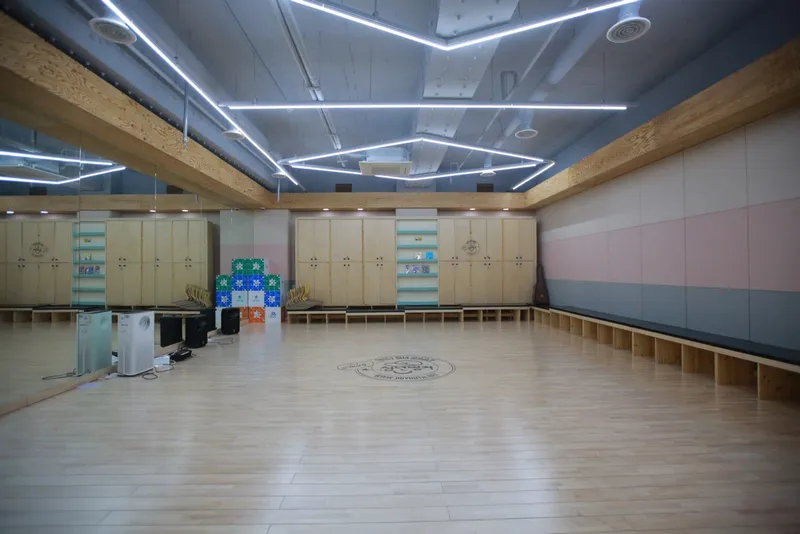댄스 홀 '트레이닝 필드'는 안무, GX 트레이닝 등 다양한 신체활동을 할 수 있는 공간입니다. 가장 먼저 들어서면 전면 거울이 보이고요. 잠시 쉴 수 있는 벤치와 물품을 놓는 공간, 선반과 빔프로젝터 장비도 활용할 수 있습니다.