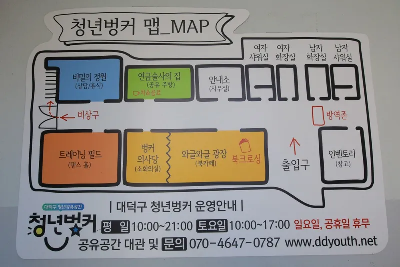 '청년벙커' 입구에는 어떤 공간이 있는지 안내되어 있습니다. 북카페, 소회의실, 댄스 홀, 공유 주방, 상담/휴식 공간, 사무실 등으로 이루어져 있습니다.