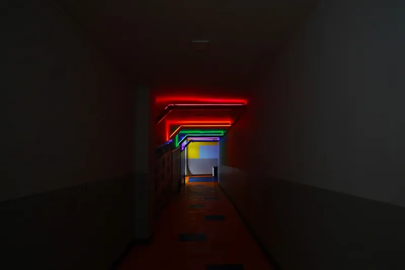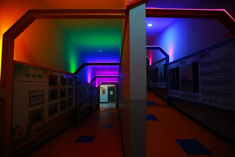 지층에 있는 '청년벙커'는 계단 없이 약간 기울어져 있습니다. 아래로 점차 내려가는데요. 색색의 조명 등이 동선에 따라 켜지는데, 터널처럼 보이기도 하고 각 선의 색이 달라 분위기가 인상 깊었습니다. 어두운 곳에서 움직임에 따라서 불이 켜져 실제로 벙커 안으로 들어가는 듯합니다.
