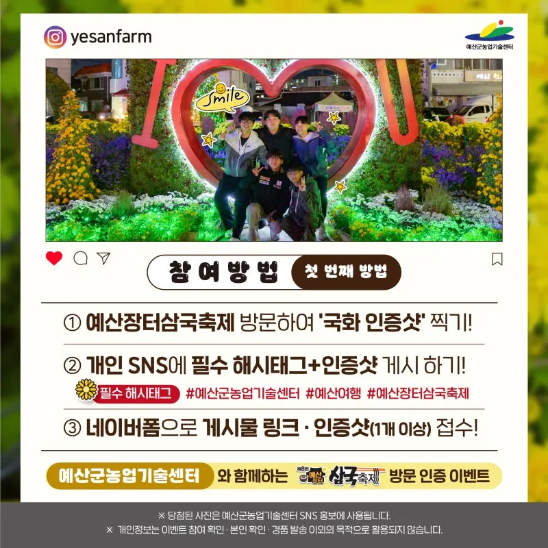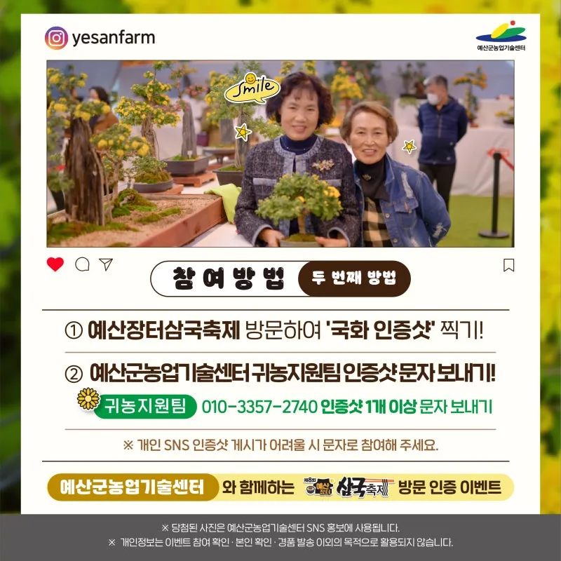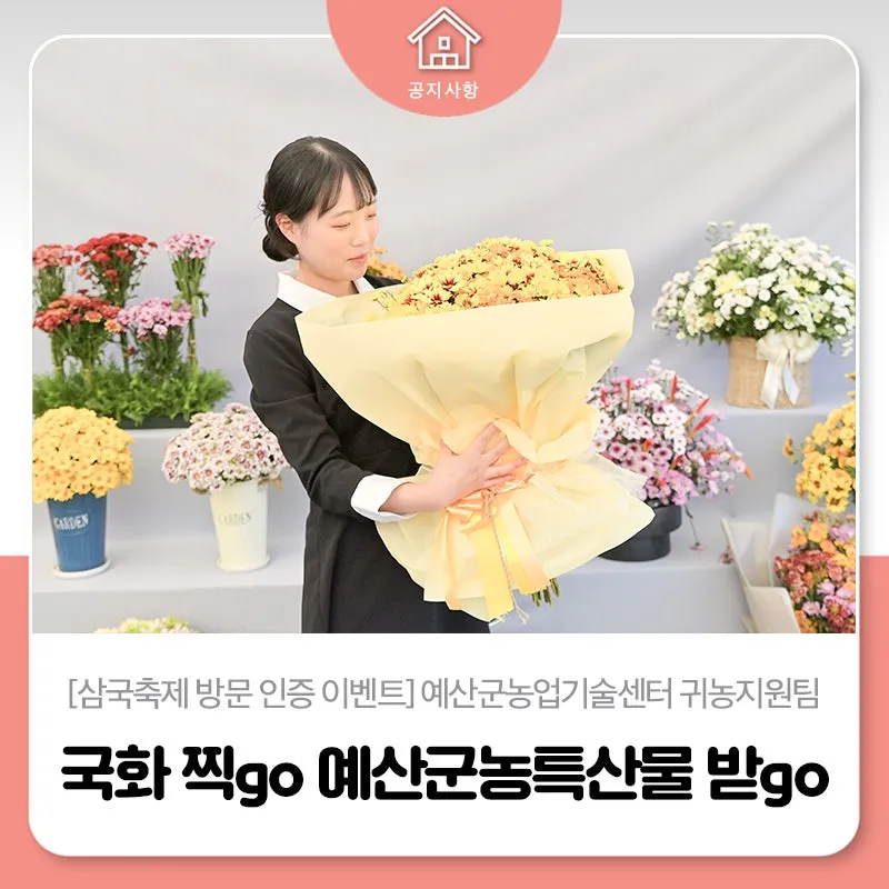 [삼국축제 방문 인증 이벤트] 예산군농업기술센터 귀농지원팀 - 국화 찍go 예산군농특산물 받go