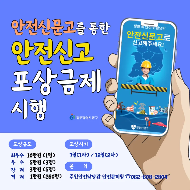 ○ 포상대상 : 안전신문고를 통한 안전신고 중 실적우수 신고자 ○ 포상규모 - 최우수 10만원(1명), 우수 5만원(3명), 장려 3만원(5명), 격려 1만원(260명) ○ 포상시기 : 7월(1차), 12월(2차) - 1차 : 2025. 1. 1. ~ 6. 30. 신고실적 - 2차 : 2025. 7. 1. ~ 12. 20. 신고실적 ○ 지급방법 : 계좌이체 또는 모바일상품권 ○ 문의사항 : 동구청 주민안전담당관 안전관리계 (☎062-608-2804) |