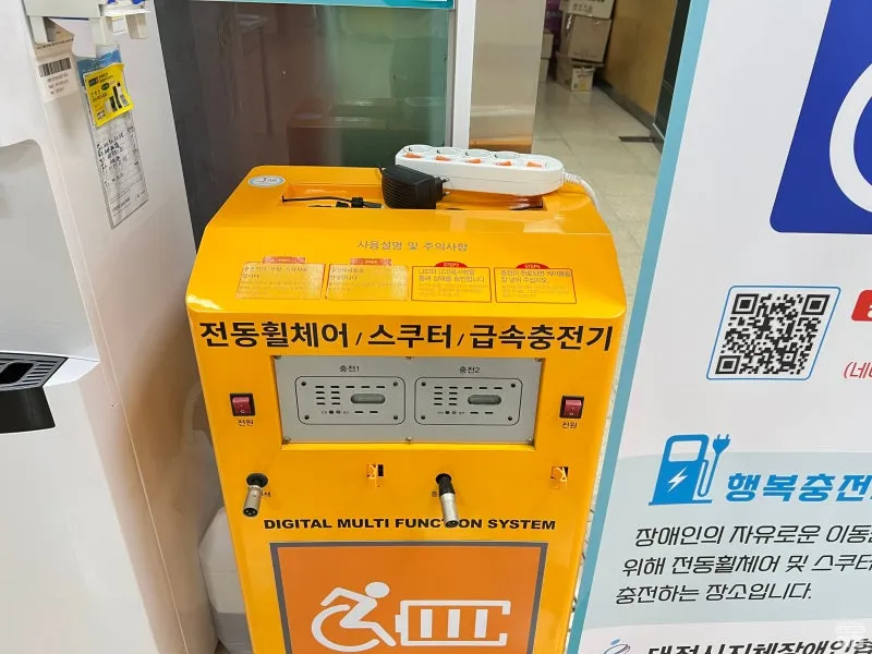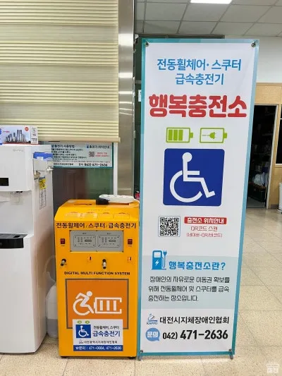 전동휠체어, 스쿠터 급속충전이 가능한 행복충전소도 있었습니다. 우리가 생각하는 스쿠터 충전이 아닌 장애인의 자유로운 이동권 확보를 위한 전동휠체어 및 스쿠터를 급속 충전하는 곳이니 참고해 주세요. 이 곳 말하고도 충전소가 이곳저곳 있으니 위치를 알고 싶으시면 QR코드를 스캔하면 됩니다.