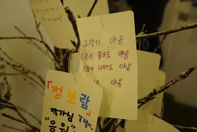 '고양이 야옹, 기분이 좋아도 야옹, 기분이 나빠도 야옹, 나도 야옹' 귀엽고 깜찍한 방명록 글귀가 인상적입니다. 전시장 한편에 마련한 방명록 코너에는 관람객이 느낀 소감과 고양이와 얽힌 나의 이야기를 남길 수 있습니다.