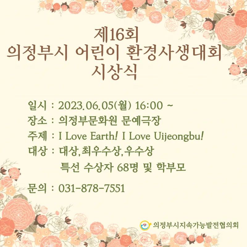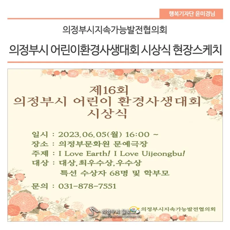 지난 4월 22일 의정부시 직동공원에서는 [어린이환경사생대회]가 의정부시주최 의정부시지속가능발전협의회 주관으로 있었는데요 6월 5일 그 시상식이 의정부시 문화원에 있다고 해서 다녀온 포스팅을 하려고 합니다.
