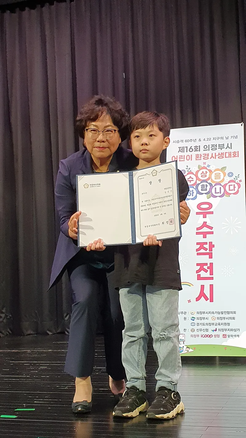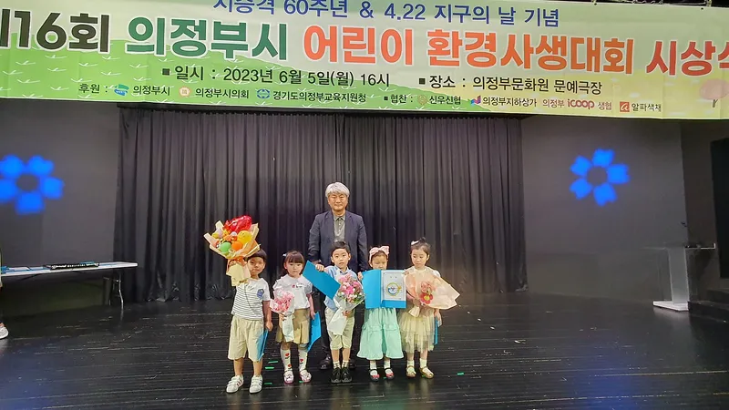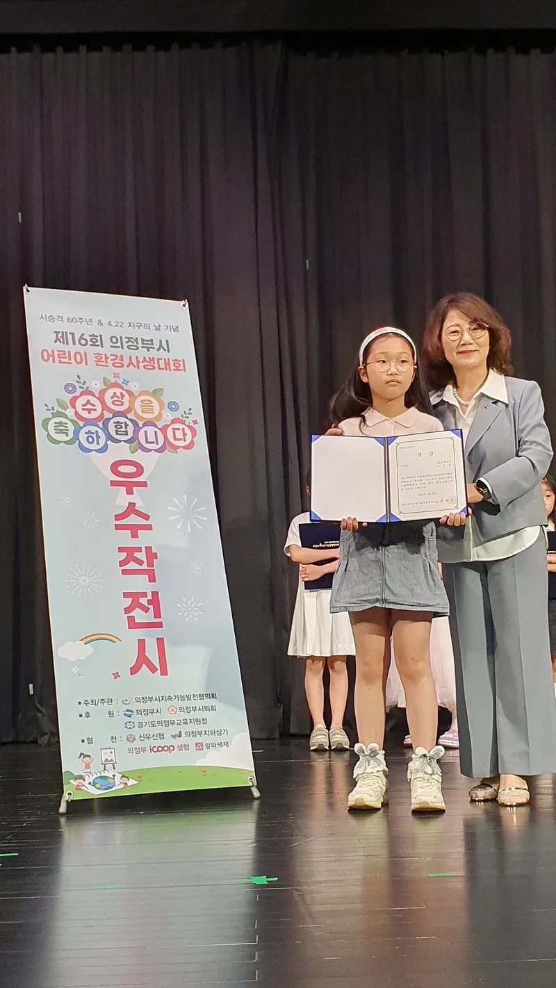 수상을 위해서 최정희 시의원, 원순자 의정부교육청 교육장, 사유철 기후환경센터센터장님이 수상을 해주셨습니다. 귀여운 아이들의 천진난만한 모습과 긴장한 모습 모두 예뻐 보였습니다.