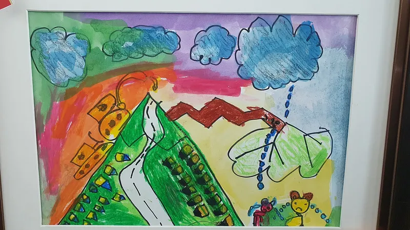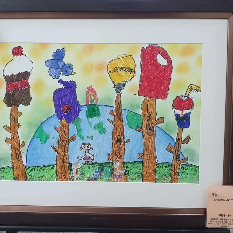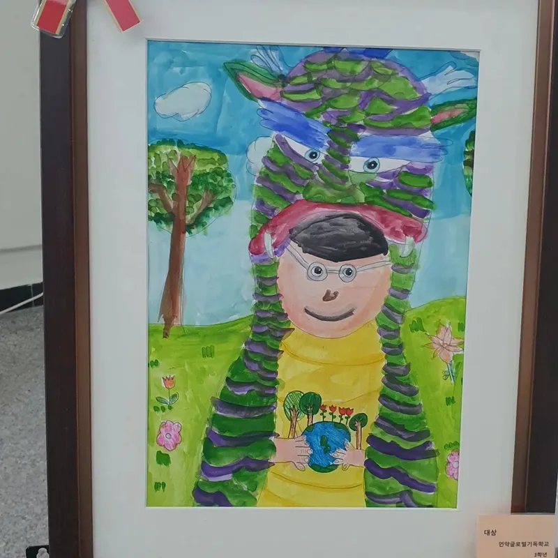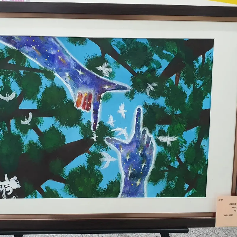 자연환경에서 나무, 새, 다람쥐, 하늘을 그렸어요. 평소 환경에 대해 관심은 없었는데 아름다운 환경을 지키고 싶다는 생각으로 손으로 나무를 비추는 모습을 그렸어요. 다른친구들 그림을 보며 앞으로 더 환경에 대해 관심을 갖게 되었어요(대상, 박가을)
