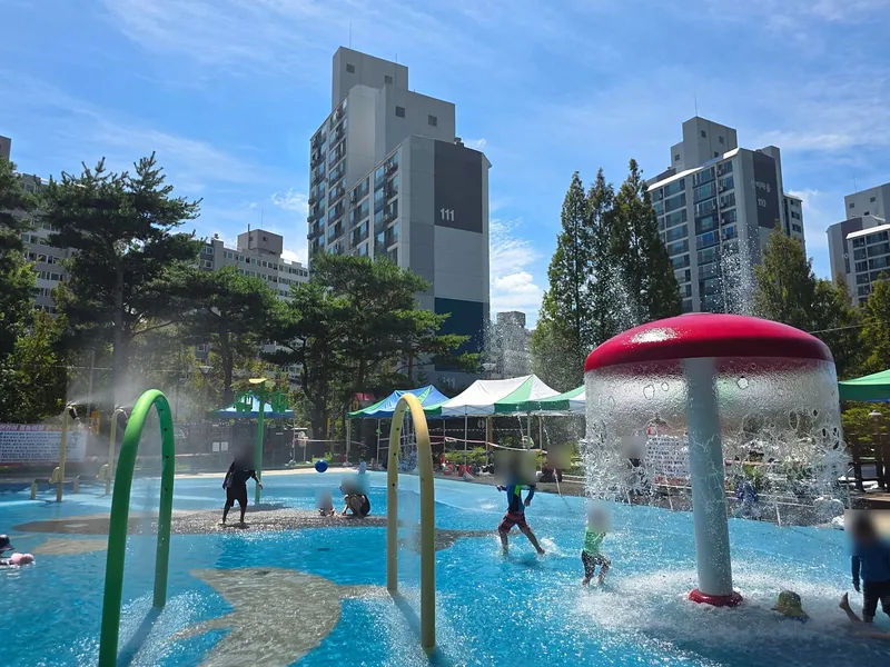 송촌체육공원 물놀이장은 아파트 단지와 인접한 곳에 위치하고 있지만 하늘을 향해 높이 뻗은 나무 덕분에 숲속에서 물놀이를 즐기는 기분을 느낄 수 있습니다.
