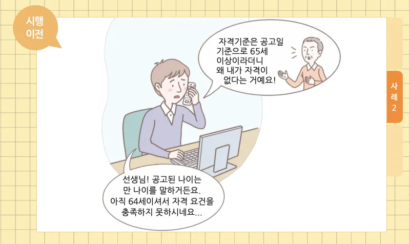 또한, 행정복지센터나 시·군·구청 직원들이 각종 행정·복지 서비스를 제공하는 과정에서는 민원인이 나이 기준을 충족하는지에 관한 민원이 많았다고 합니다.