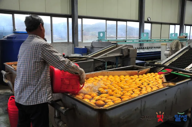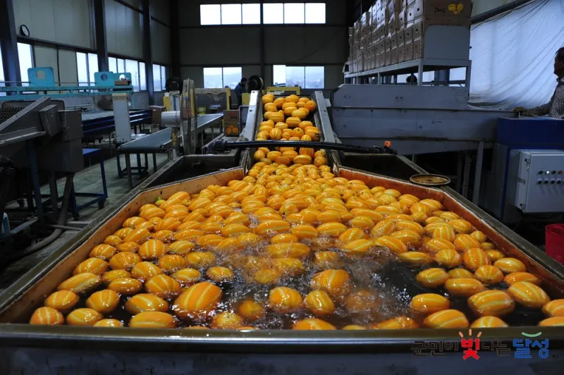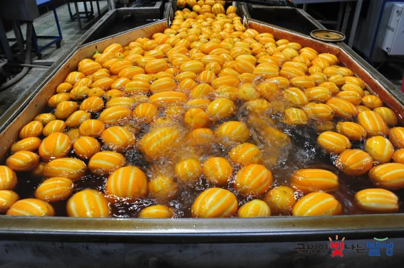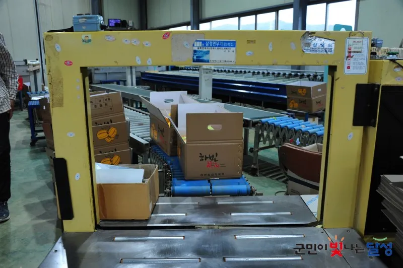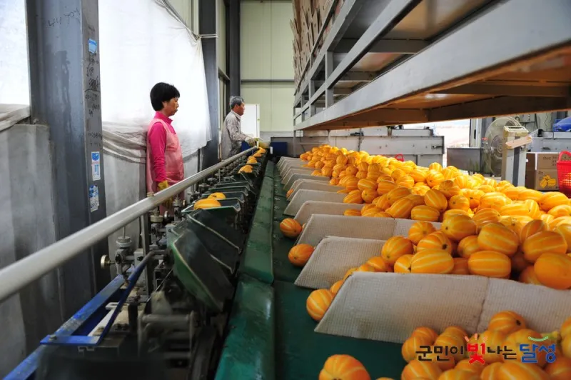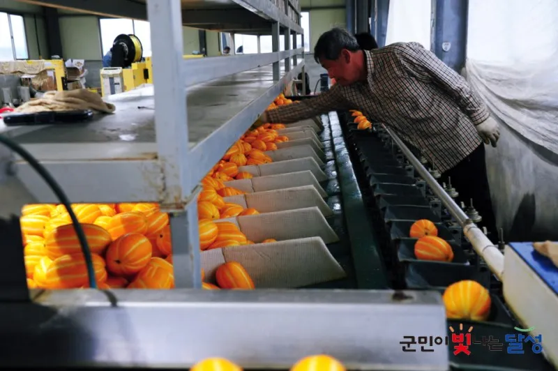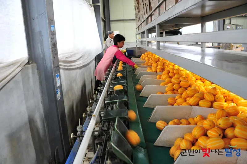 수확한 참외는 일차로 세척과정을 거쳐 무게와 크기별로 선별작업에 들어갑니다. 먼지와 이물질이 깨끗하게 세척된 참외는 컨베이어 시스템에 의해 선별기로 직행합니다.