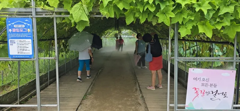 특히 그늘막이 부족한 연꽃테마파크의 공간적 특성을 반영해 기존 덩쿨하우스 구조물을 활용해 자연스러운 그늘 공간을 확보하는 한편, 물안개를 통해 시원함까지 더했습니다. 쿨링포그는 매년 6월부터 9월까지 정기적으로 운영됩니다.