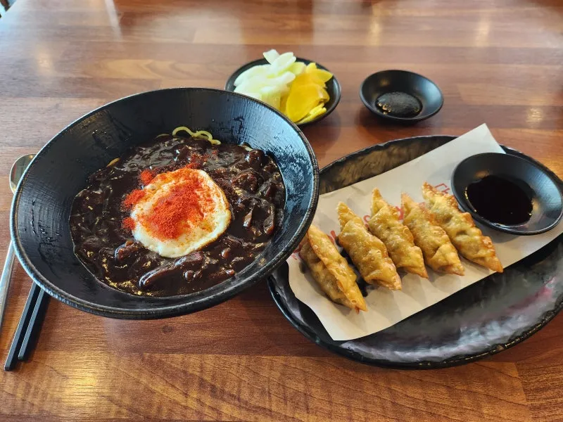 고춧가루 착착 뿌려서 전체 사진 한장! 짜장면과 군만두 모두 기본에 충실하고 느끼하지 않은 맛이었습니다. 양파와 단무지도 신선해서 좋았어요. 조금 이른 시간에 방문해도 손님이 많았는데, 회전율이 빨라서 더 신선한 것 같다는 생각이 듭니다.