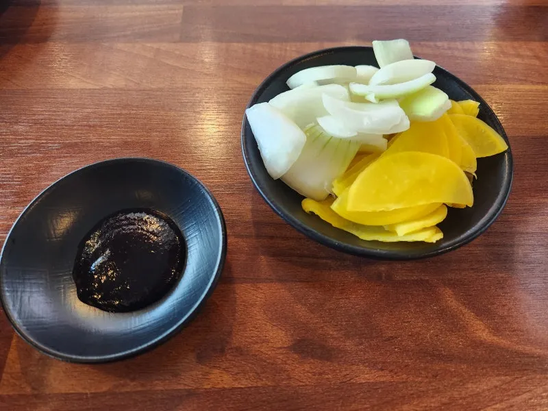 반찬 및 물은 셀프입니다. 김치와 단무지, 양파와 춘장이 준비되어 있구요. 굉장히 청결하게 관리하고 계십니다. 기름기가 있을법도 한데, 테이블에도 기름기가 없더라구요. 단무지와 양파는 상남자답게 앞접시 하나에 전부 담아왔습니다.