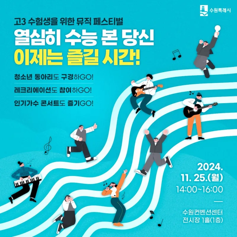 큰 시험을 끝낸 여러분을 위한 특별한 뮤직 페스티벌이 11월 25일(월) 수원컨벤션센터 1전시장에서 개최됩니다! 1VERSE, 전파상사, 아디오스오디오, 내귀에도청장치, 임단우의 멋진 공연과 함께 청소년 동아리 프로그램, 레크리에이션, 체험부스를 만날 수 있는 '고3 수험생을 위한 뮤직 페스티벌'로 지친 마음을 힐링해 보시길 바랍니다!