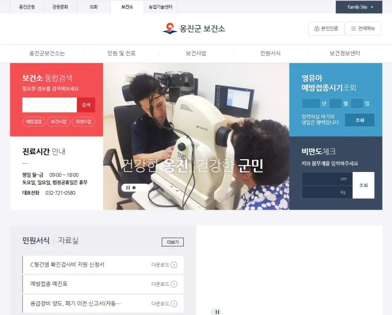 보건소 통합검색 필요한 정보를 검색해보세요 예방접종 보건사업 위생사업 진료시간 안내 평일 월~금 09:00 ~ 18:00 토요일, 일요일, 법정공휴일은 휴무 대표전화 032-721-0580 3번 이미지 건강한 옹진 , 건강한 군민 메인비주얼 멈춤 영유아 예방접종시기 조회 년 월 일 입력하실 아기의 생일은 양력 입니다 비만도 체크 키 와 몸무게 를 입력해주세요 cm kg 민원서식 C형간염 확진검사비 지원 신청서 다운로드 예방접종 예진표 다운로드 응급장비 양도, 페기 이전 신고서(자동심장충격기) [2024. 2. 16. 개정] 다운로드...