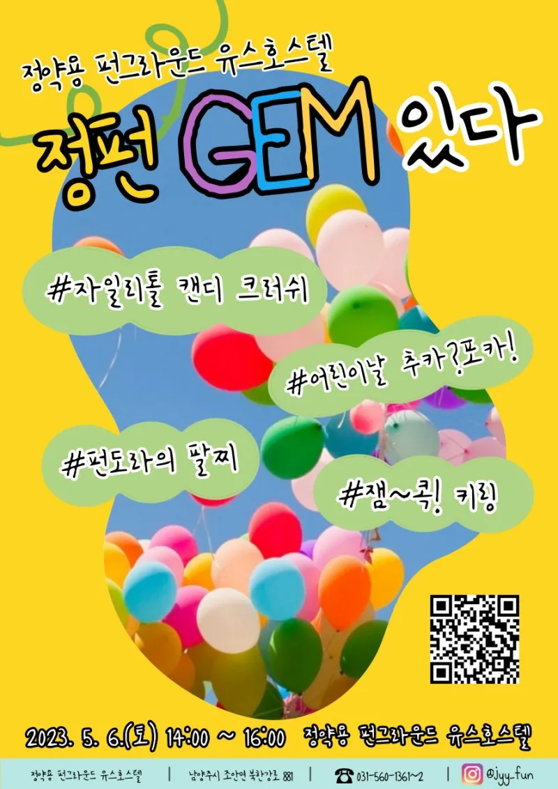 모든 펀그라운드는 아쉽게도 어린이날에는 운영되지 않는데요. 대신 다음 날인 5월 6일, 정약용펀그라운드에서 다양한 문화행사를 개최합니다. 포토카드 만들기, 보석 십자수로 키링 만들기 등 다채로운 프로그램이 진행되니, 관심 있는 분들의 많은 참여 부탁드립니다.